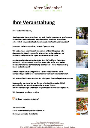 Der „Alte Lindenhof“ ist der perfekte Ort für Ihre private Feier, Ihr Jubiläum, Kommunions- oder Konfirmationsfest, zu Hochzeit, Taufe oder Reuefest. Oder Sie möchten sich mit Geschäftspartnern in einem angenehmen Umfeld entspannt austauschen oder feiern? Für Gruppen von 4 bis 150 Personen finden wir gemeinsam Lösungen, die Ihre Veranstaltung unvergesslich machen!